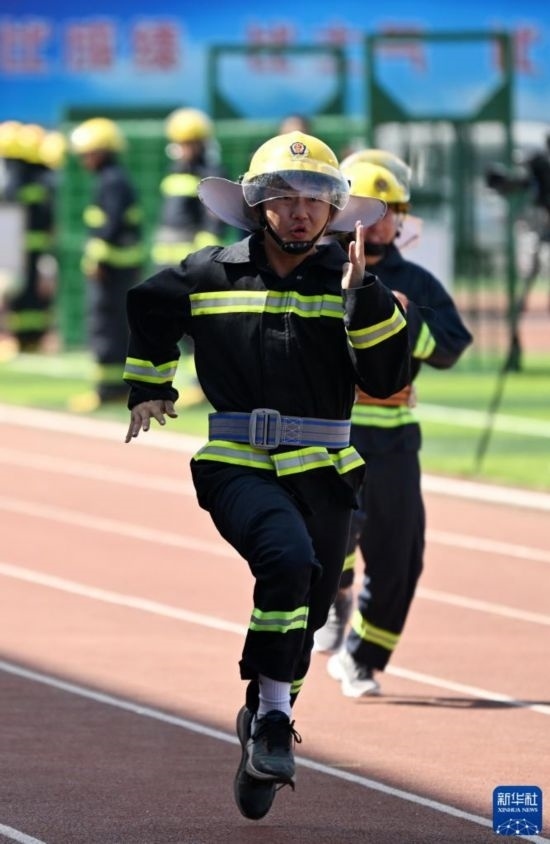 6月2日,大學(xué)生代表參加身穿消防服100米跑趣味消防運(yùn)動(dòng)比賽。