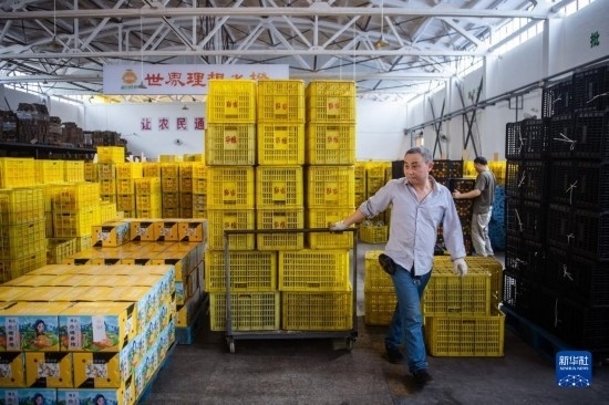 6月8日,在秭歸縣華維電商物流園區(qū)內(nèi),工作人員搬運(yùn)臍橙。