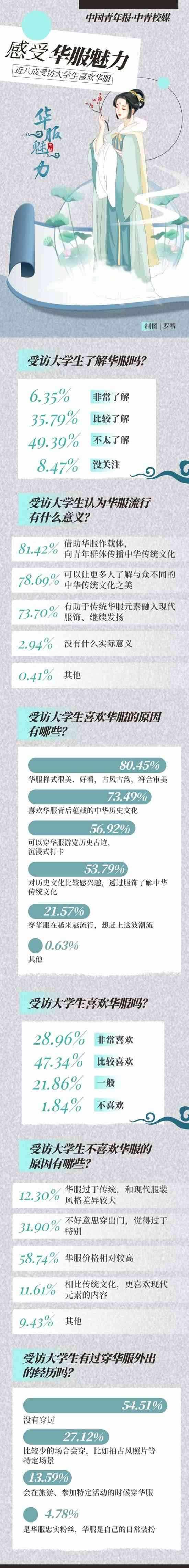 穿華服正在成為一些年輕人旅游或日常出行的選擇?!叭A服”,是指具有中華民族歷史文化基因、精神風貌,且融合當代審美的禮儀性服裝,其服裝風格根植于中華傳統(tǒng)文化,傳承中華民族特質,體現(xiàn)當代社會積極向上的時代精神,具有鮮明的辨識度,適用于國際交往、文化交流、商貿往來以及日常節(jié)慶、典祭等禮儀場合。自2018年起,每年的農歷三月初三被選定為“中國華服日”,在前不久結束的第五屆“中國華服日”活動中,上萬名青年華服愛好者匯聚活動現(xiàn)場參與體驗。近日,中國青年報社·中青校媒面向全國高校大學生發(fā)起問卷調查,共回收117所高校學生填寫的有效問卷1464份。調查結果顯示,76.30%受訪者表示喜歡華服,42.14%受訪者表示對華服有一定的了解。