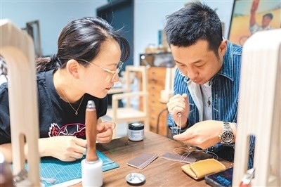 作為今年上海市為民辦實(shí)事項(xiàng)目“社會(huì)大美育課堂”的重要組成部分,今年上海市民藝術(shù)夜校春季班共開(kāi)設(shè)教學(xué)點(diǎn)位123個(gè)、課程278門(mén)、招收學(xué)員6507人。夜校學(xué)習(xí)內(nèi)容包括傳統(tǒng)文化、時(shí)尚文化、非遺技藝、江南文化以及區(qū)域文化等。圖為5月8日,上海市寶山區(qū)淞南鎮(zhèn)社區(qū)文化活動(dòng)中心,老師(右)正在指導(dǎo)學(xué)生皮具制作技巧。王 初攝(人民圖片)