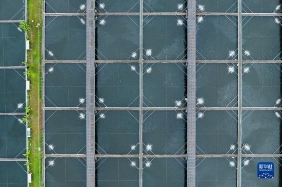 6月7日,中國(guó)清江(宜都)鱘魚谷工作人員在給鱘魚投喂餌料。