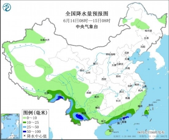 6月14日08時(shí)至15日08時(shí),云南中南部和西部、廣西南部、廣東中南部、臺(tái)灣島中南部、西藏東南部等地有大雨,局部地區(qū)有暴雨(50~90毫米)(見圖4)。