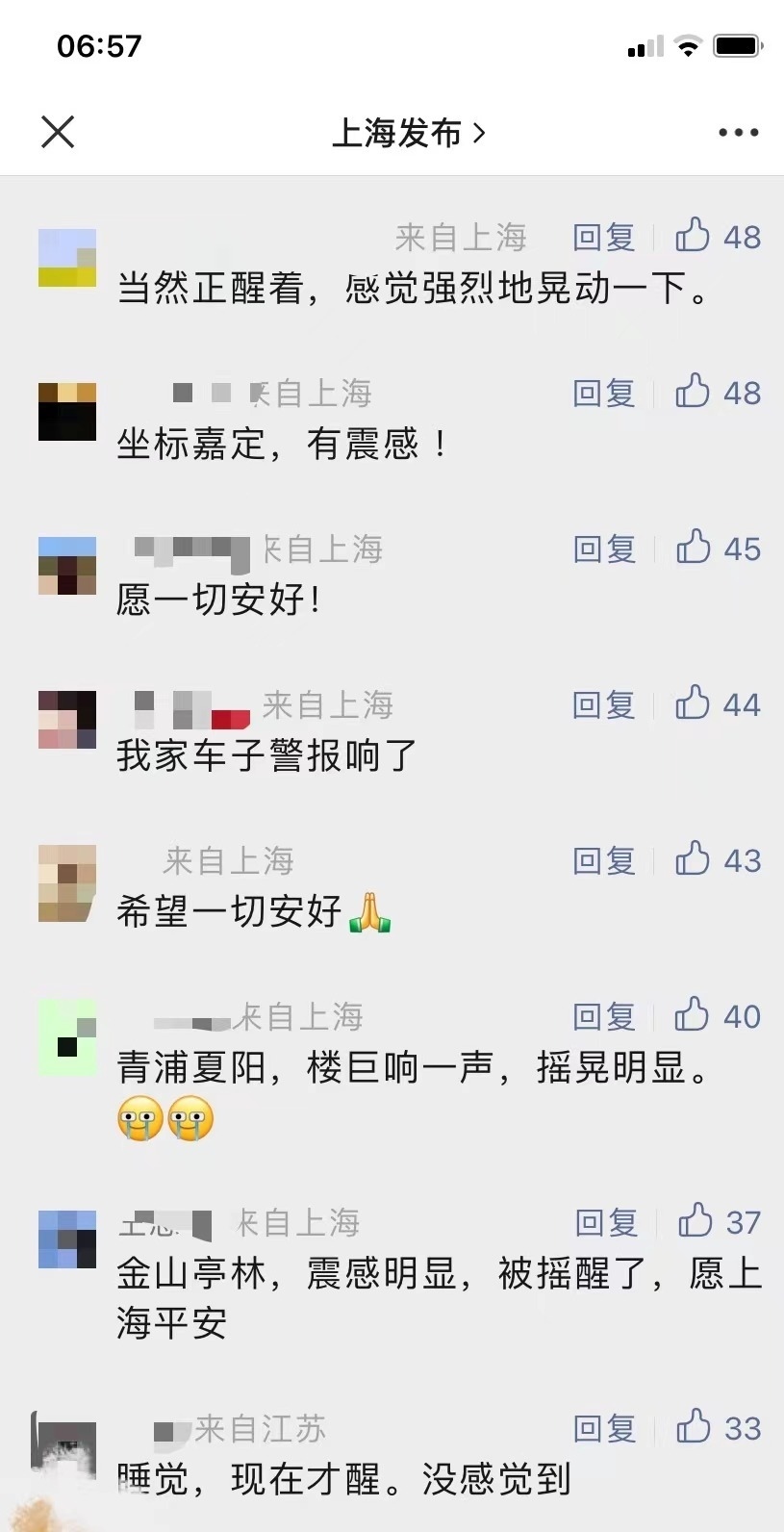 有網(wǎng)友表示,“床明顯在晃動”“持續(xù)了四五秒”“徐匯輕微有震感”,不過也有很多網(wǎng)友表示,“在睡夢中完全沒有感覺到”。