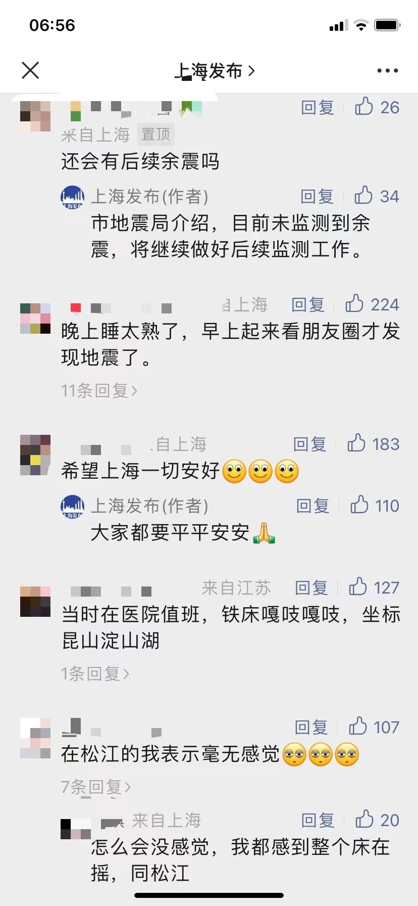 “上海發(fā)布”在微信公眾號留言中回復:市地震局介紹,目前未監(jiān)測到余震,將繼續(xù)做好后續(xù)監(jiān)測工作。