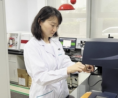 南京市產(chǎn)品質(zhì)量監(jiān)督檢驗(yàn)院綠色可降解材料質(zhì)檢中心副主任朱南幫企業(yè)做測試實(shí)驗(yàn)。蔣若晗攝