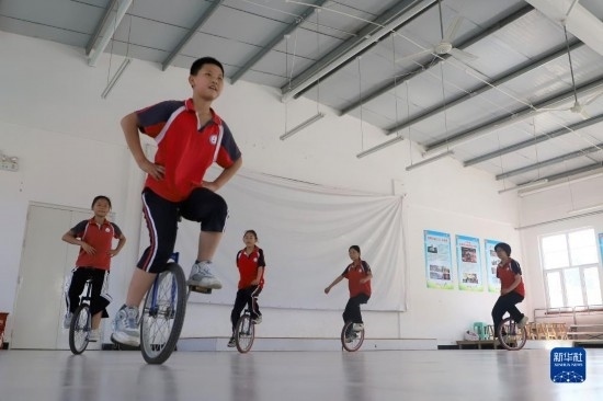 6月15日,在河北省滄州市吳橋縣馬庫(kù)吏小學(xué),學(xué)生練習(xí)雜技獨(dú)輪車。