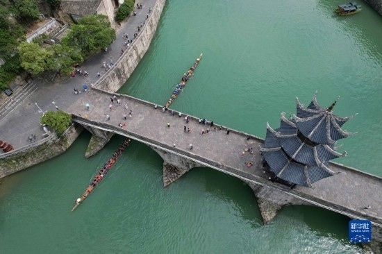 6月17日,游客在鎮(zhèn)遠(yuǎn)古城 陽河畔體驗劃龍舟(無人機(jī)照片)。