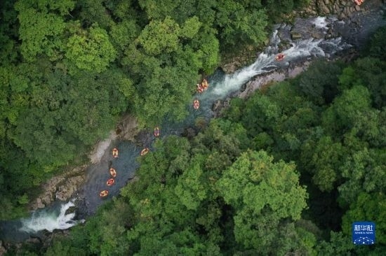 6月17日,游客在鎮(zhèn)遠(yuǎn)縣高過河景區(qū)漂流(無人機(jī)照片)。
