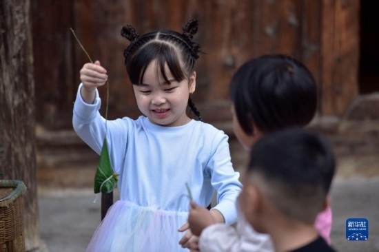 6月16日,小朋友在鎮(zhèn)遠(yuǎn)古城 陽河畔體驗包粽子。