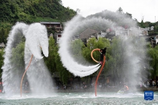 6月17日,工作人員在鎮(zhèn)遠(yuǎn)古城 陽河畔進(jìn)行水上飛人表演。