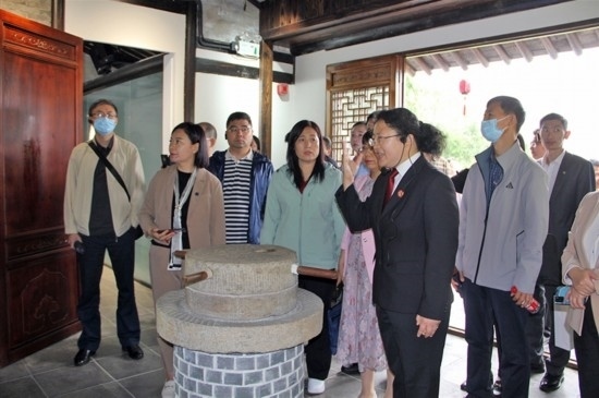 正值初夏,上海市奉賢區(qū)青村鎮(zhèn)吳房村,世外桃源般的江南水鄉(xiāng)風(fēng)貌引人入勝。沿著吳房村的青石板路,代表們一路考察、一路交流,從三治堂到四堂間,深入了解奉賢區(qū)法院訴源治理平臺(tái)“奉法客堂間”工作情況。