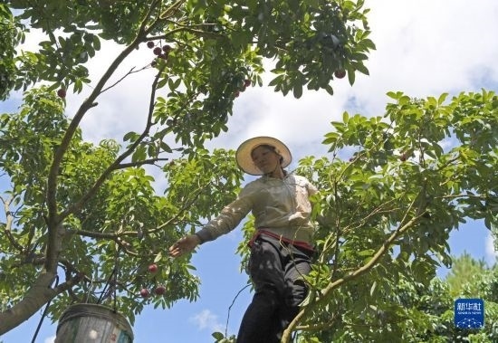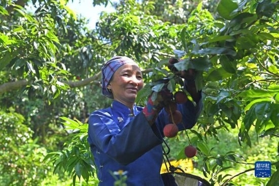 6月27日,廣西北流市北流鎮(zhèn)六行村村民在采摘荔枝。