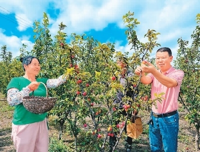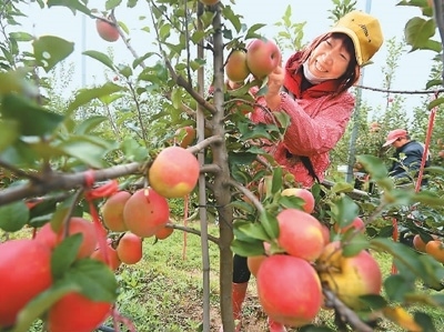 江蘇省宿遷市斯味特萬畝蘋果產(chǎn)業(yè)示范區(qū),園區(qū)職工在采摘蘋果。 楊群、張思遠攝影報道 |
