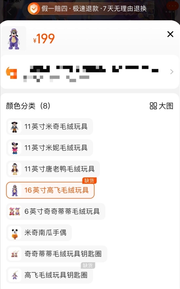9月27日中午11點多,紅星新聞記者在上海迪士尼樂園官方旗艦店看到,該系列商品同一用戶每天購買總數(shù)量至多2件,16英寸高飛毛絨玩具、高飛毛絨玩具鑰匙圈均顯示“缺貨”。記者咨詢客服是否還會補貨,截至發(fā)稿時未收到回復。