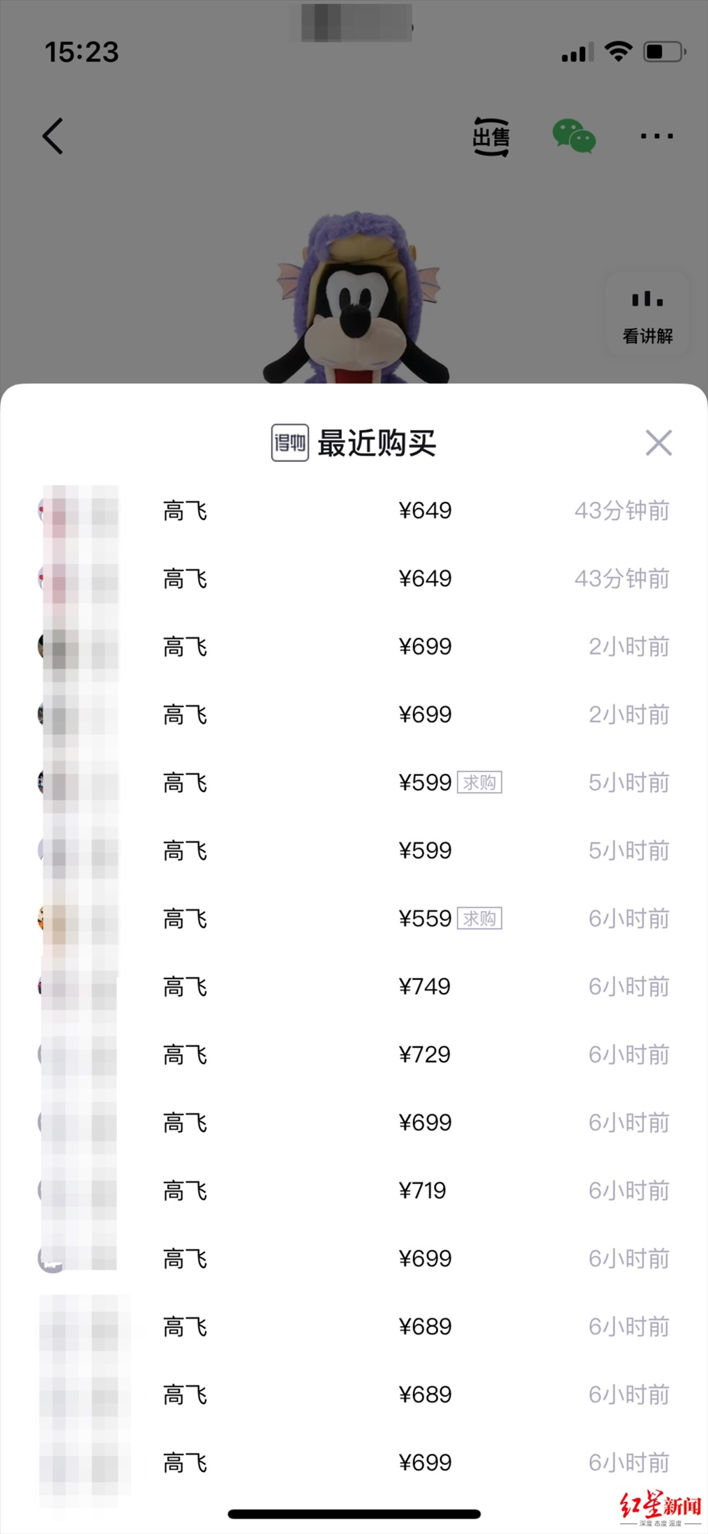 ▲網(wǎng)友爆料有人8000元出售“紫龍高飛”毛絨玩具