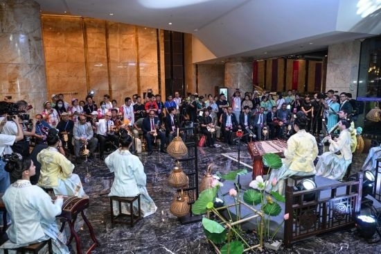 9月29日,嘉賓們?cè)趤唺W理事會(huì)大家庭總部飯店活動(dòng)現(xiàn)場(chǎng)欣賞江南絲竹《水鄉(xiāng)蓮韻》表演。新華社記者 陳曄華 攝