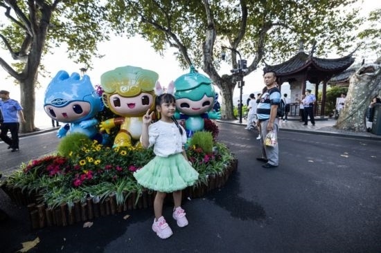9月29日,游客與杭州西湖斷橋邊的亞運(yùn)會(huì)吉祥物合影。新華社發(fā)(伊凡 攝)