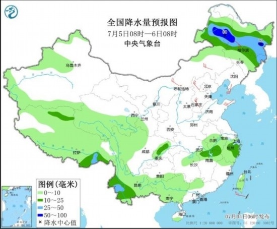 全國降水量預報圖(7月4日08時-5日08時)。圖片來源:中央氣象臺網(wǎng)站