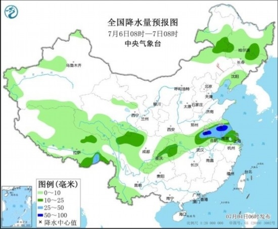 全國降水量預報圖(7月6日08時-7日08時)。圖片來源:中央氣象臺網(wǎng)站