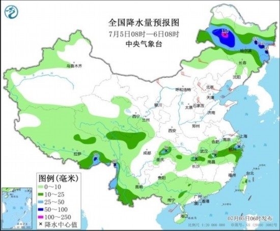 全國降水量預(yù)報圖(7月5日08時-6日08時)。圖片來源:中央氣象臺網(wǎng)站