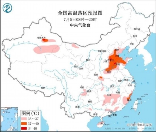 預(yù)計7月5日白天,河北中南部和東北部、北京大部、天津、山東大部、河南中北部及湖南中南部、江西中南部、福建中東部、廣東中部、新疆南疆盆地東部等地有35℃以上高溫天氣,其中,河北中南部、北京東部、天津南部、山東中北部、河南北部等地部分地區(qū)最高氣溫37~39℃,局地可達(dá)40℃以上。中央氣象臺7月5日06時繼續(xù)發(fā)布高溫黃色預(yù)警。