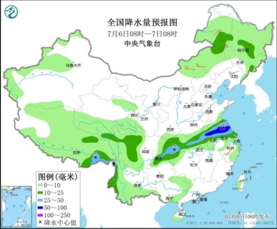 7月6日08時至7日08時,內(nèi)蒙古東北部、黑龍江南部、西藏東部、江淮、江漢中南部、江南東北部、川西高原、重慶、云南西部等地部分地區(qū)有中到大雨,其中,蘇皖中部等地部分地區(qū)有暴雨或大暴雨(100~110毫米)。內(nèi)蒙古中東部、遼寧、山東、浙江中部等地部分地區(qū)有4~6級風(fēng)。