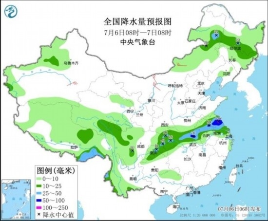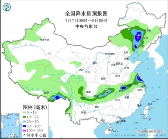 全國降水量預(yù)報(bào)圖(7月6日08時(shí)-7日08時(shí))。圖片來源:中央氣象臺網(wǎng)站