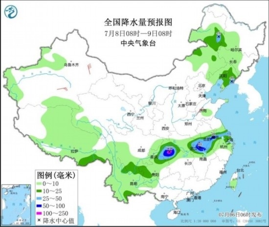 7月8日08時(shí)至9日08時(shí),內(nèi)蒙古東北部、黑龍江西南部、遼寧中東部、蘇皖南部、上海、湖北東部和西南部、江西北部、湖南西北部、重慶東南部、貴州北部等地部分地區(qū)有中到大雨,局地有暴雨或大暴雨(100~120毫米)。新疆南疆盆地等地的部分地區(qū)有4~6級風(fēng)。