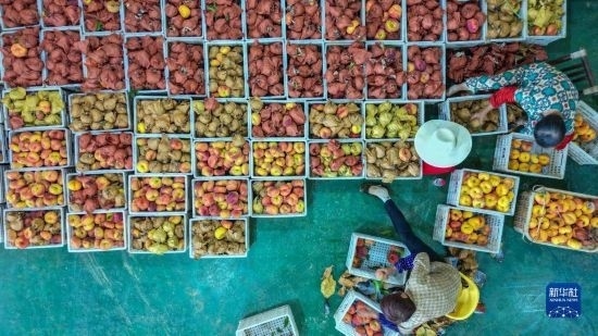 7月7日,在臨湘市聶市鎮(zhèn)乘嶺社區(qū)的涓湖果園,果農(nóng)在分揀蟠桃(無人機照片)。