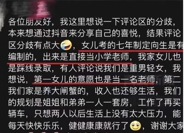 據(jù)女孩媽媽稱,孩子考的“七年貫通培養(yǎng)師范定向生”是有編制的,出來直接當小學老師。家里不缺錢,只希望姐弟倆以后生活輕松快樂。