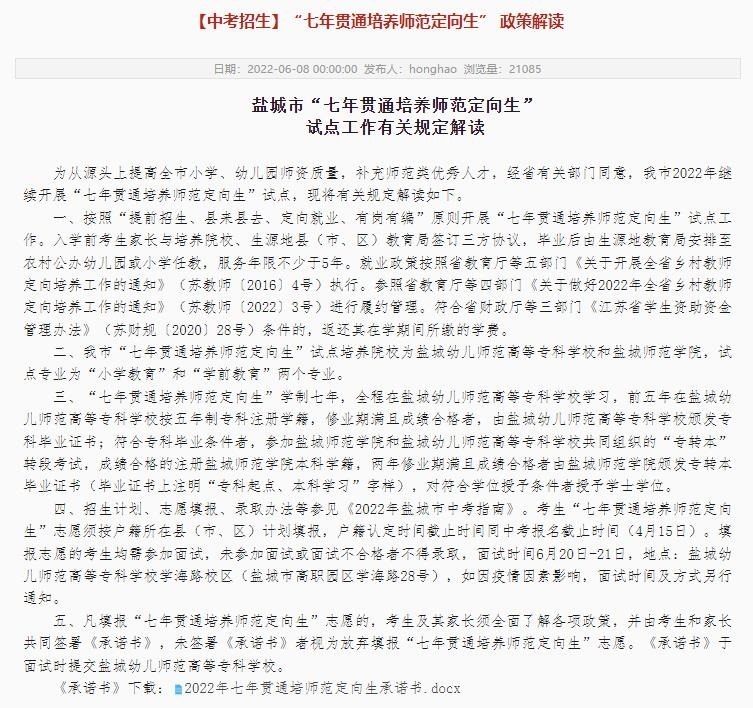 記者從鹽城幼兒師范高等專科學校官網(wǎng)看到,鹽城市從2021年起開始試點培養(yǎng)“七年貫通師范定向生”,試點培養(yǎng)院校為鹽城幼兒師范高等??茖W校和鹽城師范學院,試點專業(yè)為“小學教育”和“學前教育”兩個專業(yè)。