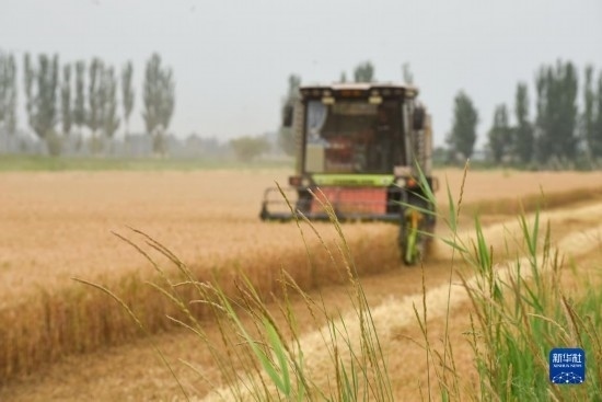 7月10日,在石嘴山市平羅縣姚伏鎮(zhèn),聯(lián)合收割機(jī)在麥田里作業(yè)。