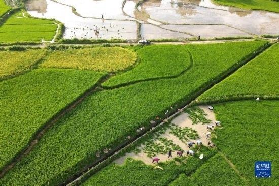 7月11日,在湖南省婁底市雙峰縣井字鎮(zhèn)花山村,農(nóng)民在田間起秧(無(wú)人機(jī)照片)。