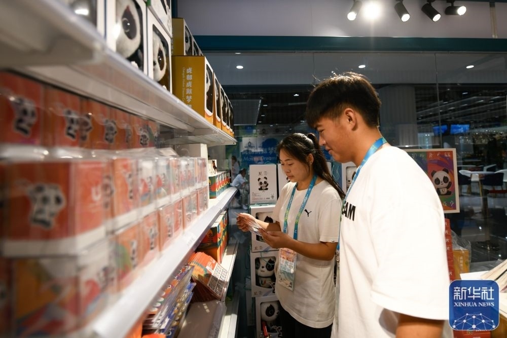 ↑7月14日,媒體工作人員在成都大運會主媒體中心大運會官方特許商品零售店內(nèi)選購紀念品。新華社記者 胥冰潔 攝