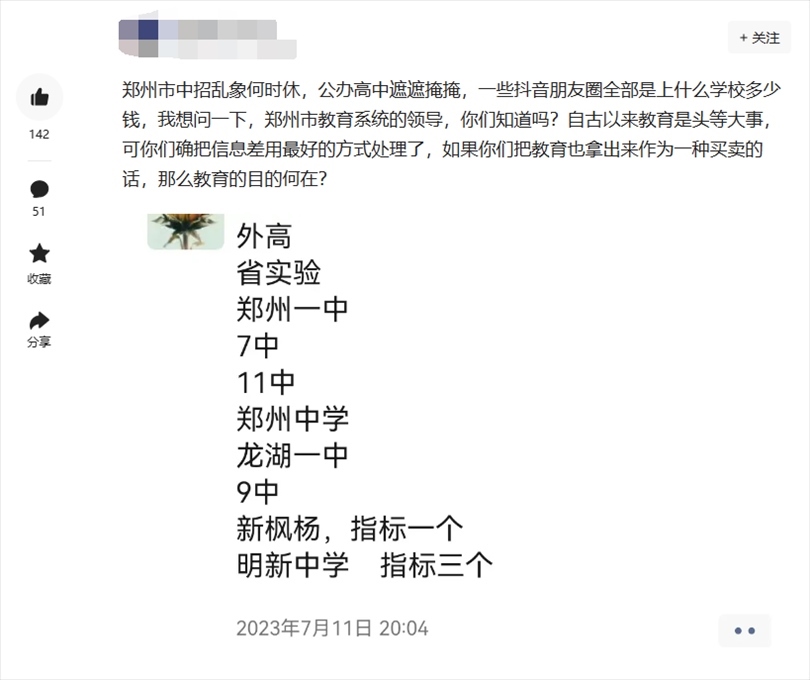 7月16日,有群眾通過頂端新聞“我想@領(lǐng)導(dǎo)”平臺(tái)向鄭州市教育局局長(zhǎng)留言:“掏錢就能上?鄭州中招販賣名額成風(fēng)”“公開賣高中名額,鄭州教育局都不管嗎”等類似留言。