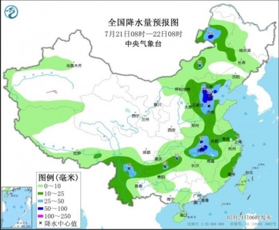 預計,7月21日08時至22日08時,內蒙古東北部、河北東部、北京、天津、山東西北部、河南東南部、湖北東部、江西北部、四川南部等地部分地區(qū)有大到暴雨,其中,河北中部、北京東南部、天津南部等地局地有大暴雨(100~130毫米)。上述部分地區(qū)伴有短時強降水(最大小時降雨量20~50毫米,局地可超過60毫米),局地有雷暴大風等強對流天氣。中央氣象臺7月21日06時繼續(xù)發(fā)布暴雨藍色預警。