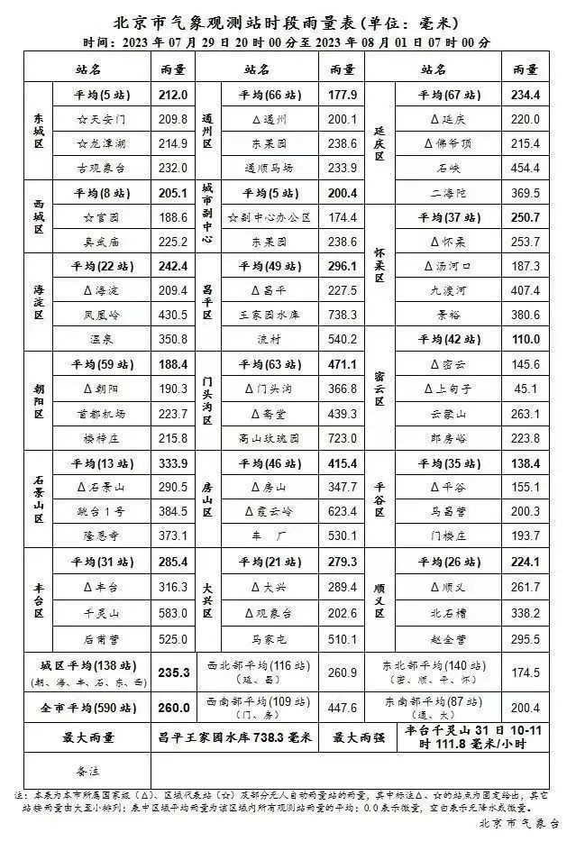 據(jù)北京市氣象臺(tái)消息,29日20時(shí)至8月1日7時(shí),北京地區(qū)全市平均降雨量260.0毫米,城區(qū)平均235.3毫米,房山區(qū)平均415.4毫米,門頭溝區(qū)平均471.1毫米;最大小時(shí)雨強(qiáng)出現(xiàn)在豐臺(tái)千靈山,31日10-11時(shí)111.8毫米/小時(shí)。
