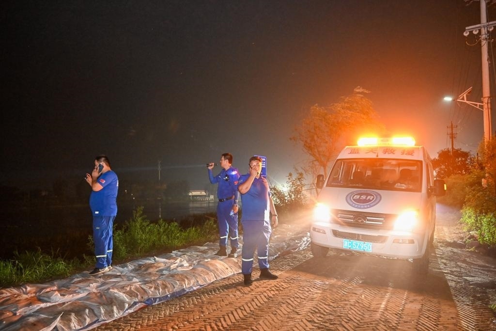 8月4日,在大清河天津靜海段北堤,天津靜海藍(lán)天救援隊(duì)隊(duì)員夜間巡堤時(shí)發(fā)現(xiàn)隱患點(diǎn)后,通過燈光指引和對(duì)講機(jī)呼話,與南堤隊(duì)員協(xié)同處理。新華社記者 孫凡越 攝