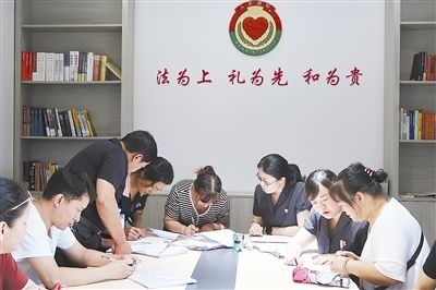 圖①:干警聯(lián)合調(diào)解員在“萬(wàn)家法律驛站”進(jìn)行調(diào)解。