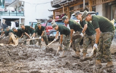 8月8日,武警河北總隊(duì)保定支隊(duì)組織突擊隊(duì)在河北省淶水縣清理淤泥。本報(bào)記者 張武軍攝