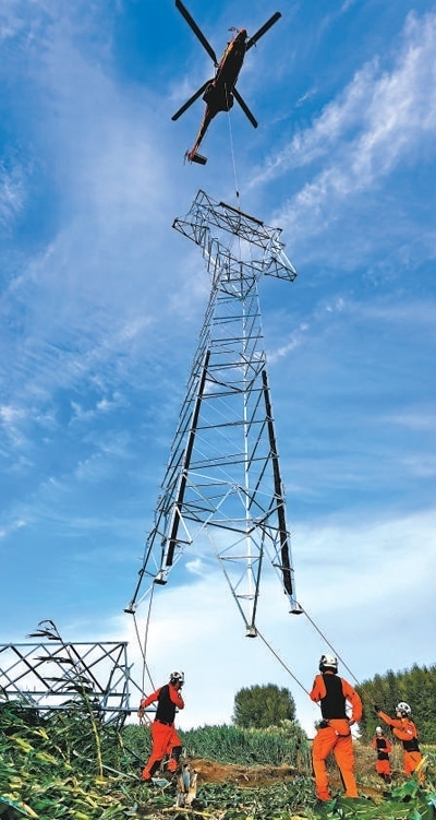 8月9日,國(guó)家電網(wǎng)公司調(diào)配直升機(jī)支援黑龍江電力恢復(fù)工作。圖為直升機(jī)在牡丹江海林110千伏海長(zhǎng)線搶修現(xiàn)場(chǎng)整塔吊裝作業(yè)中。方 圓 張恩全攝影報(bào)道