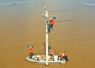 8月9日,國(guó)網(wǎng)長(zhǎng)春供電公司搶修人員在吉林省榆樹(shù)市懷家12組進(jìn)行作業(yè),為受災(zāi)群眾恢復(fù)生活用電。孟海鷹 張 鵬攝影報(bào)道