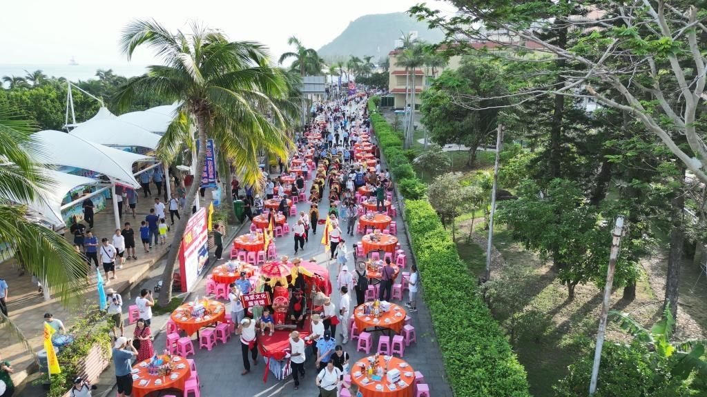 上千桌宴席沿街?jǐn)[開,來自五湖四海的游客和當(dāng)?shù)貪O民們歡聚一堂,沐浴著星光與海風(fēng),從五柳紅古魚,到海膽海鮮飯,一道道漁家美食端上餐桌,讓食客品嘗舌尖美味,感受來自海陵島的獨(dú)特風(fēng)味。