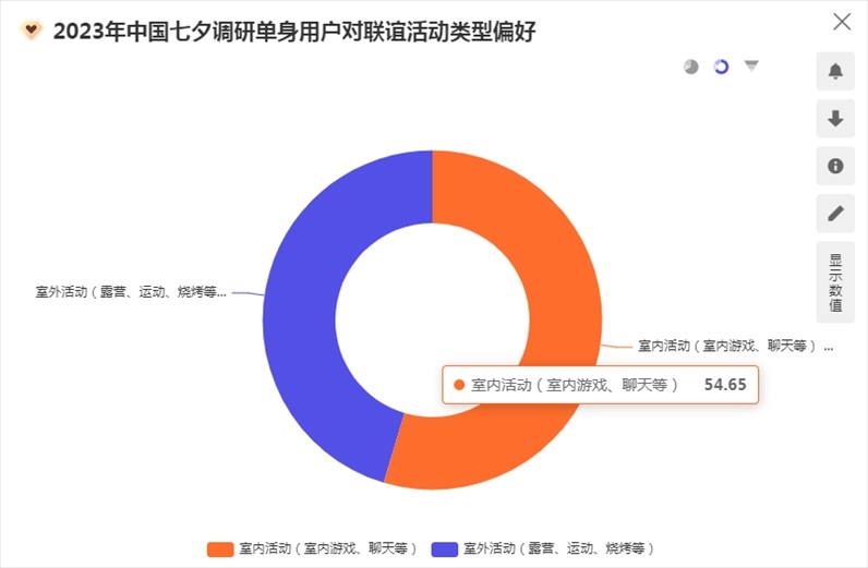 “單身經濟與浪漫經濟并不沖突。”張毅告訴記者,今年單身人士參加七夕節(jié)交友聯(lián)誼活動意愿強烈,“有53.77%的表示會參加。在聯(lián)誼活動的選擇上,54.65%的人會選擇劇本殺、密室逃脫、桌游等室內活動。”
