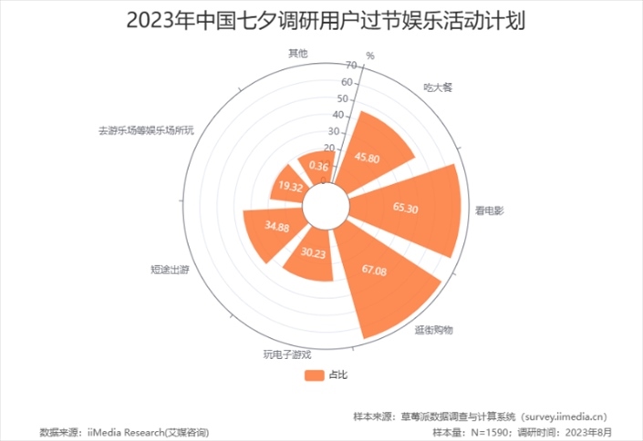 今年七夕恰逢工作日,大多數人選擇下班后再相聚。“中國七夕節(jié)日消費行為大數據調查”顯示,2023年消費者過節(jié)的娛樂活動計劃TOP3分別為:逛街購物、看電影、吃大餐。