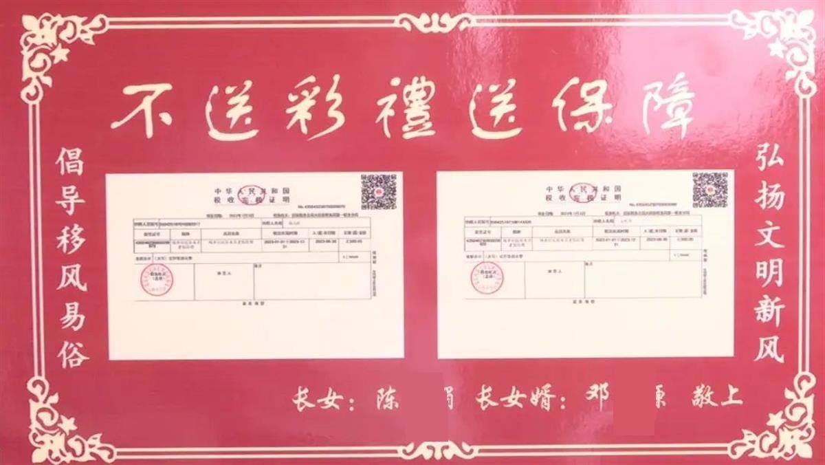 報(bào)道稱,8月17日,文江鎮(zhèn)的鎮(zhèn)村干部來到該鎮(zhèn)的聯(lián)盟村,將“不送彩禮送保障”的牌子送到新人陳某媚父母家中。文章配發(fā)的照片中,陳某媚的父母捧著印有兩張養(yǎng)老保險(xiǎn)繳費(fèi)單的牌子合影,底下的落款為長(zhǎng)女陳某媚和長(zhǎng)女婿鄧某塬的名字。