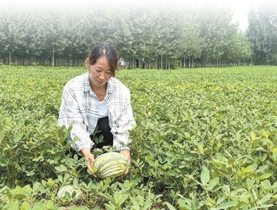 魯小國(guó)的妻子肖利萍在西瓜花生套種的地里采摘西瓜。本報(bào)記者 王 者攝