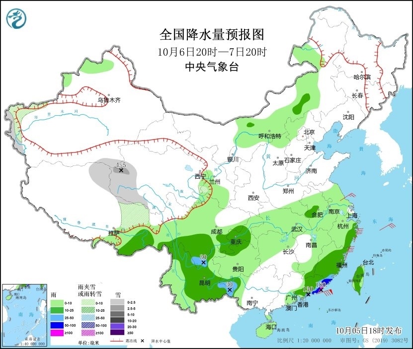 10月5日20時(shí)至6日20時(shí),西藏東北部、青海中南部和東北部、甘肅西北部等地部分地區(qū)有小到中雪或雨夾雪,青海西北部局地有大雪;西藏東南部、陜西南部、四川盆地東部、重慶、貴州西部、云南東北部、湖北西部、廣東東部沿海、福建南部及臺灣島南部等地部分地區(qū)有中到大雨,其中,西藏東南部、臺灣島南部等地部分地區(qū)有暴雨(50~75毫米)。西藏西部、四川盆地中部等地有5~6級風(fēng)、陣風(fēng)7級,浙江沿海、福建沿海、廣東東部沿海、臺灣島西北部沿海等地有6~8級風(fēng)、陣風(fēng)9級(見圖1)。