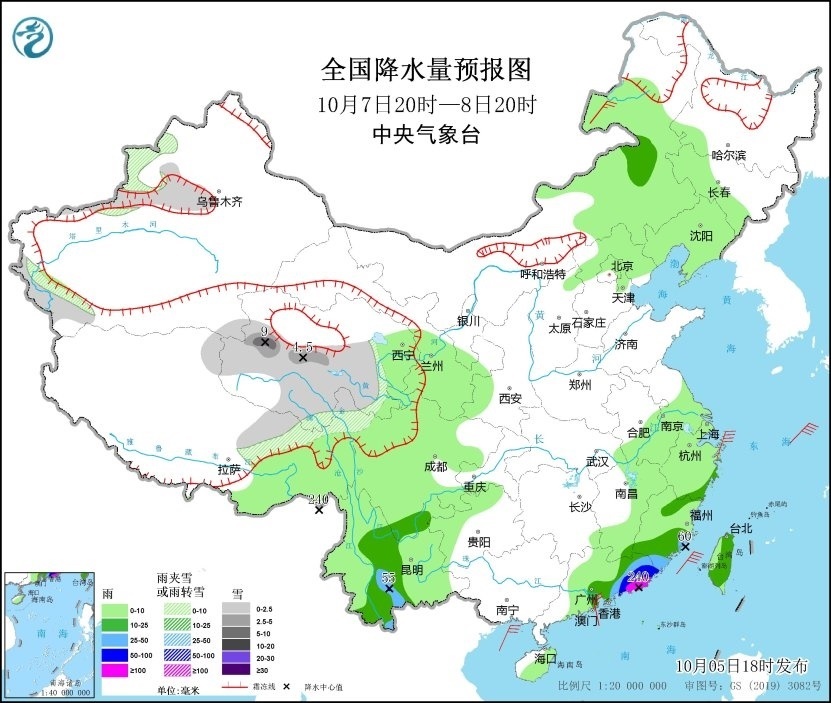 10月7日20時(shí)至8日20時(shí),青海中南部、西藏東北部、新疆西部等地部分地區(qū)有小雪或雨夾雪,青海中部局地有中到大雪;四川南部、云南中部、浙江南部、福建南部、廣東東部、臺灣島等地部分地區(qū)有中到大雨,其中廣東東部、福建南部、云南南部等地部分地區(qū)有暴雨,廣東東部沿海地區(qū)局地有大暴雨(100~240毫米)。浙江、福建和廣東沿海等地有4~6級風(fēng)、陣風(fēng)7級;東海西南部及中部海域、臺灣海峽、南海東北部偏北海域有6~7級風(fēng)、陣風(fēng)8~9級(見圖3)。
