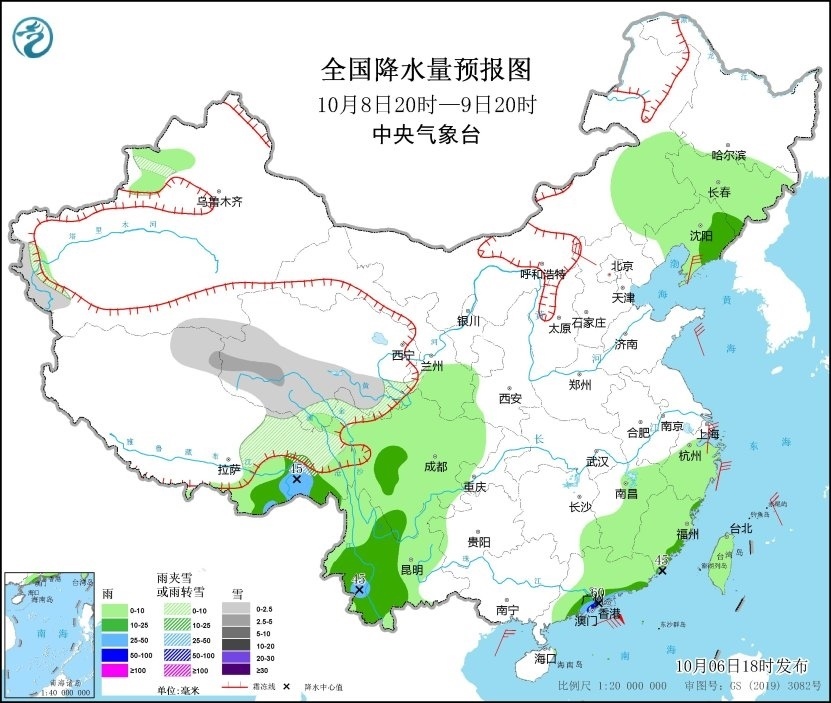 10月6日20時至7日20時,新疆南疆盆地西部沿山地區(qū)、青海南部、西藏東部等地有小到中雪或雨夾雪;西藏東南部、四川盆地東部和南部、云南中東部、福建中南部、廣東東部、海南島南部、臺灣島西部等地部分地區(qū)有中到大雨,其中,廣東東部和福建南部沿海等地局部地區(qū)有暴雨(50~65毫米)。內蒙古中東部、遼東半島、浙江東部沿海等地部分地區(qū)有4~6級風,西藏中部部分地區(qū)有6~7級風。臺灣海峽將有6~7級、陣風8級的東北風,南海東北部海域將有8~9級、陣風10級的偏北風(見圖1)。